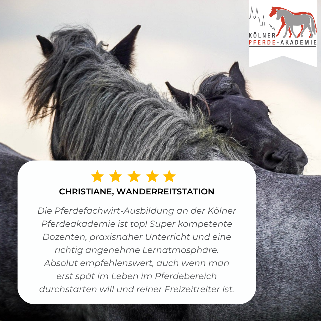 Die Kölner Pferde-Akademie bietet Ausbildungen, Weiterbildungen und Sachkundelehrgänge für Pferdehalter, Pferdebetriebe und Fachkräfte im Pferdesektor an. Seit vielen Jahren unterstützt die Akademie Menschen dabei, ihre Kenntnisse rund um Pferdehaltung, Pferdetraining und Betriebsführung zu vertiefen.