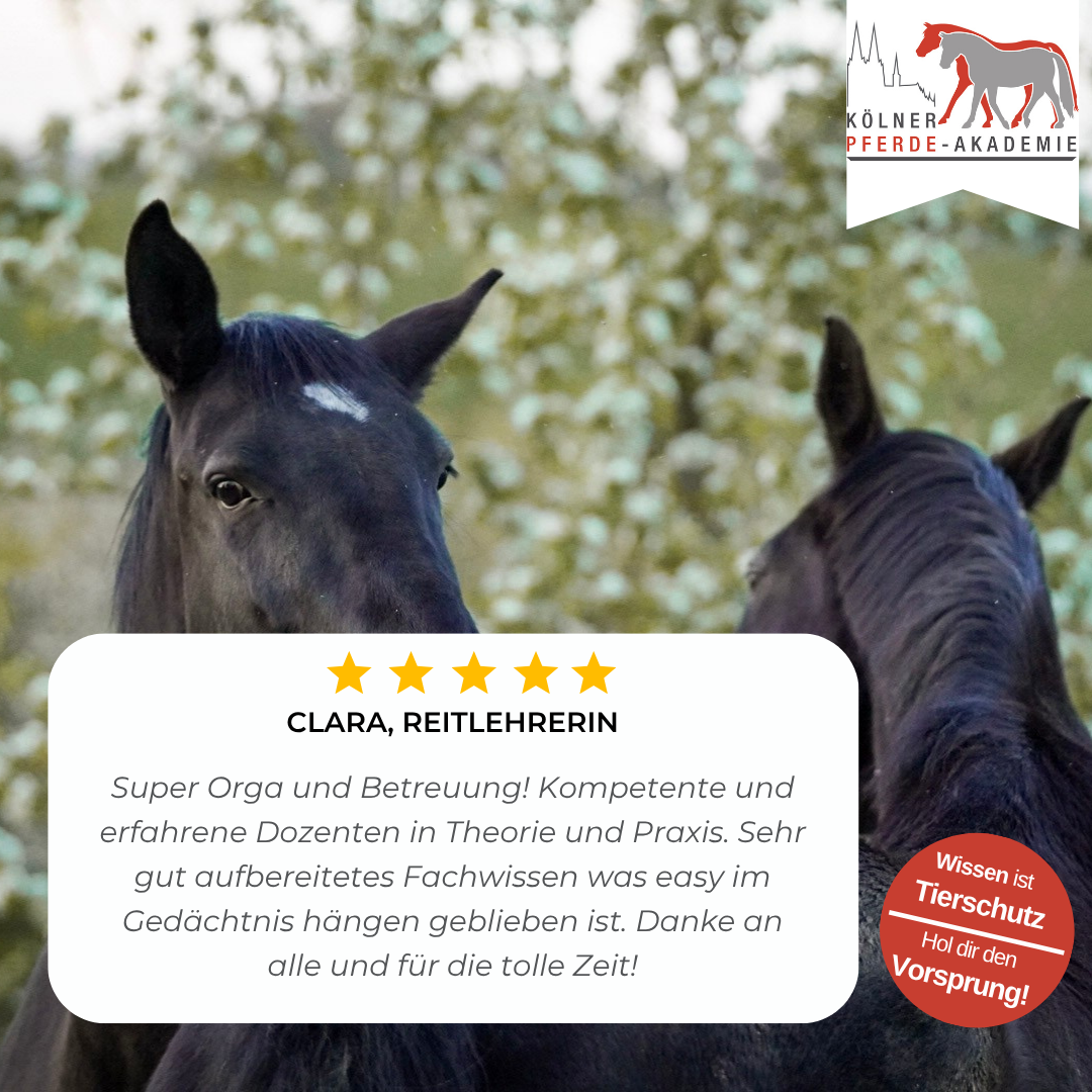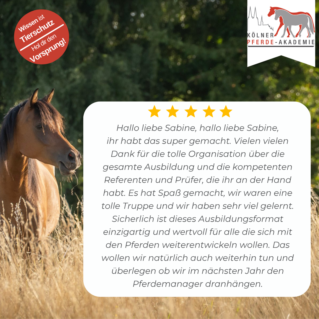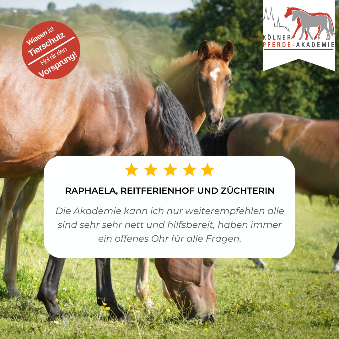 Kölner Pferde-Akademie Qualifikationen für Pferdehalter, Betriebsleiter und Selbstständige Konzept Team Termine & Buchung Kontakt Sachkunde Pferdehaltung Sachkunde Pferdetransport Alle Einzelkurse Pferdefachwirt Vorbereitungslehrgang Pferdewirt Zertifizierter Pferdebetriebsmanager Reitlehrer KPA FN Abzeichen Basisqualifikation Pferdezucht Fördermöglichkeiten FAQs / Häufig gestellte Fragen Qualitätsmanagement
